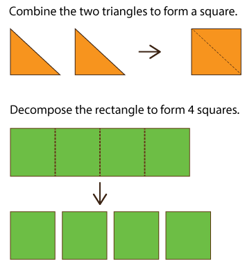 Composing is combining or joining two or more shapes to form a new shape. Decomposing, as the name implies, is the splitting or breaking a shape into two or more shapes. An example is illustrated below