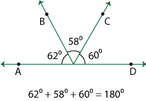 Now, we will learn more pairs of angles for grade 6 to grade 8 like linear, vertically opposite and adjacent angles here. Before you know all these pairs of angles there is another important concept which is called ‘angles on a straight line’. The sum of angles on a straight line is 180 degree. Thus, any number of angles on a straight line amounts to 180 degree.
