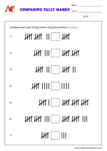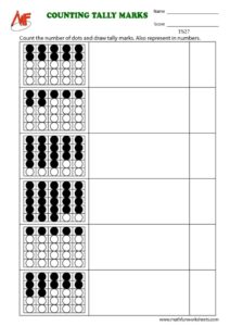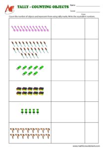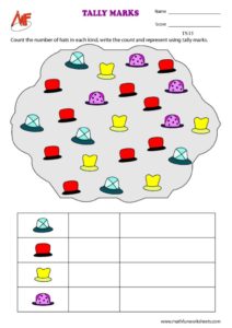 Tally marks are an easy way to represent information. Four vertical lines are drawn and the fifth line is a diagonal line which is drawn striking all the four vertical lines. We have Tally charts given for reference. Using these charts you will learn to represent the five lines accordingly. This becomes an easy graphical representation of data and is the first skill children learn in statistics. So in these worksheets, collecting, organizing, and interpretting data would be taught. We also need to analyse the data wherever necessary. Statistics therby develops the critical and analytical thinking of children making them to arrive to conclusions accurately.